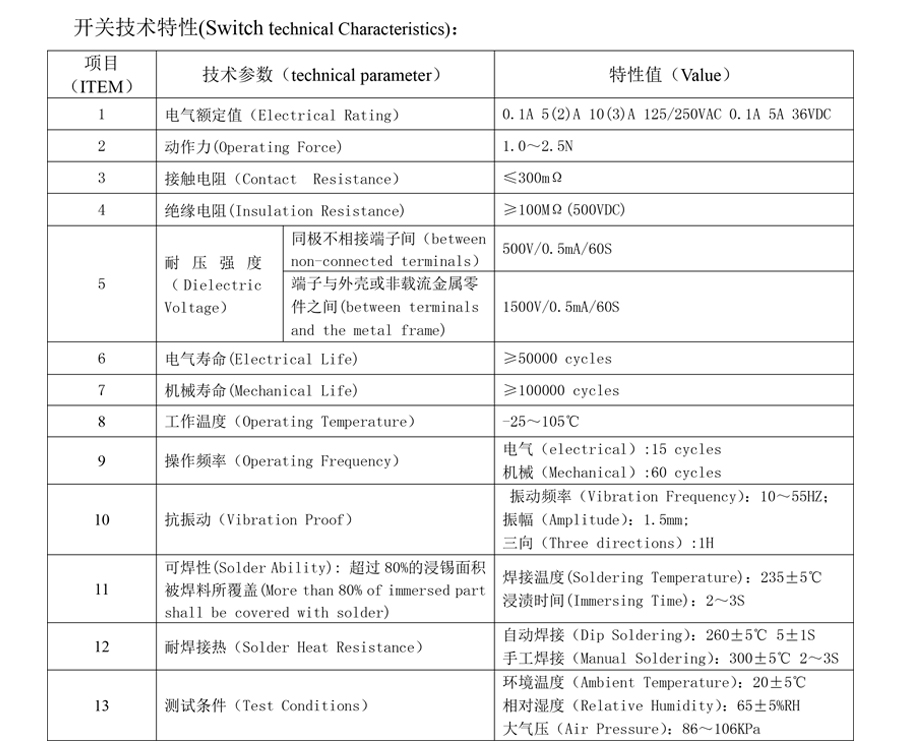 | 1 | လျှပ်စစ်အဆင့်သတ်မှတ်ချက် | 0.1A 5(2)A 10(3)A 125/250VAC 0.1A 5A 36VDC | |